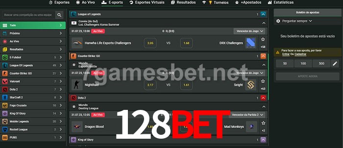 O 128Bet oferece uma grande seleção de opções de apostas em e-sports com probabilidades competitivas